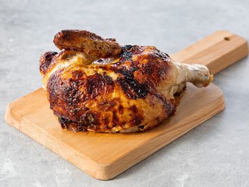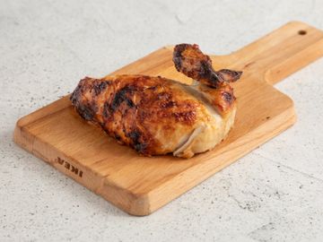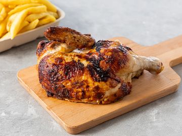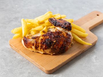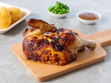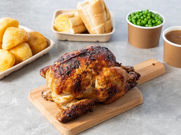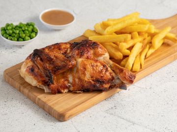 1/2 Roast chicken, serve of chips or 3 roast vegetables, serve of peas, small gravy