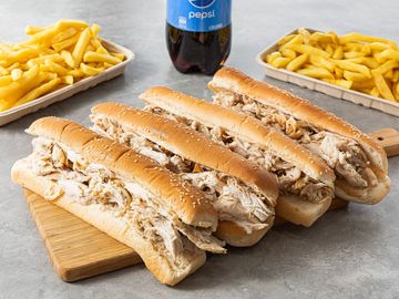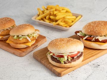 2 Chicken or Beef Burgers, 2 Mini Chicken or Cheese Burgers, Family Chips and 1.25L Soft Drink