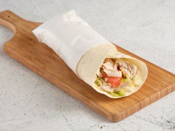 10" Tortilla, peeled roast chicken, mayo, lettuce, tomato