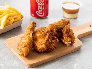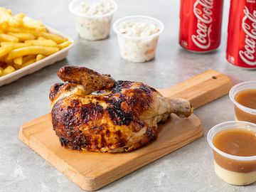 1/2 Chicken, 2 small potato + gravy, large chips and 2 375ml drinks