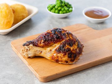 1/4 Roast chicken, serve of chips or 2 potatoes, serve of peas, small gravy