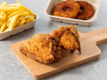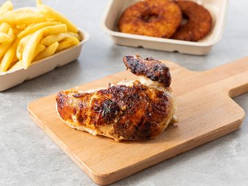 1/4 Roast chicken, serve of chips, 2 pineapple fritters