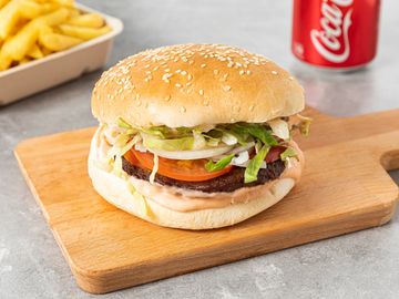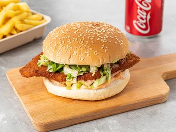 Sesame seed bun. crumbed chicken breast schnitzel, bacon, american cheese, special sauce, lettuce