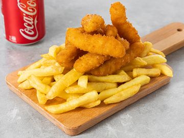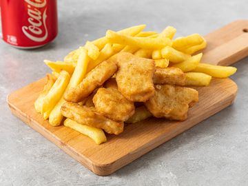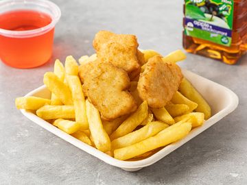 4 chicken nuggets, serve of chips, 250ml drink and dessert