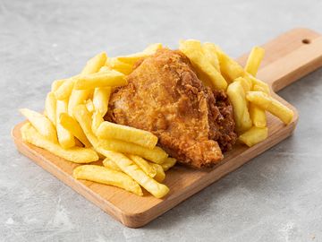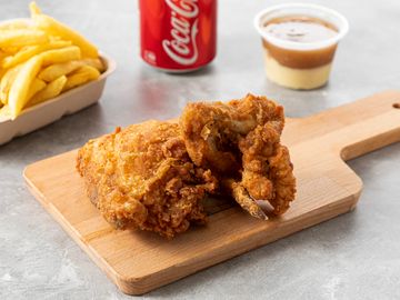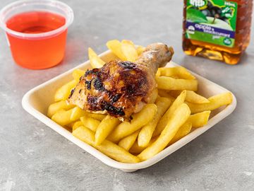 Chicken drumstick, serve of chips, 250ml drink and dessert