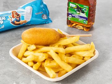 Mini dagwood dog, serve of chips, 250ml drink and dessert