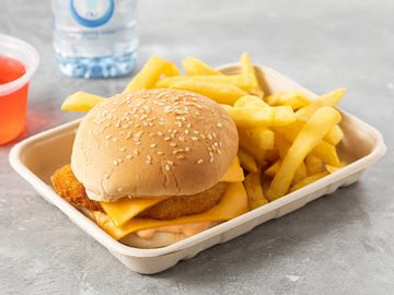 Mini chicken burger with special sauce, american cheese and lettuce, serve of chips, 250 ml drink and dessert