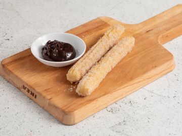 2 mini/large churros coated in cinnamon/chocolate sugar with a chocolate dipping sauce